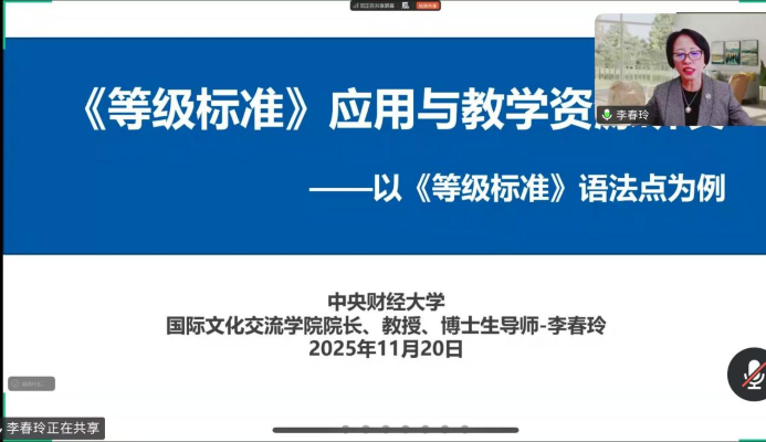 作为深耕国际中文教育领域的专家,李春玲教授围绕《等级标准》的核心价值展开分享,指出该标准是当前国际中文教育的重要行业依据,不仅构建了系统的能力框架与量化指标,更在教学设计、教材编写、语言测评等实践环节中发挥着指导性作用,为一线教学与资源建设提供了清晰方向。同时,李春玲教授解析了《等级标准》与3.0版HSK考试大纲的紧密关联—后者正是基于《等级标准》进行的升级优化,在能力分级、应用场景等方面更贴合当下的学习与使用需求。她还结合自身实践经验,阐释了如何以《等级标准》为基础推进教学资源的落地研发,内容兼顾专业深度与实用性。讲座互动环节,与会师生围绕教学资源研发的实际难点、行业标准的应用细节等议题交流探讨,李春玲教授逐一回应,讲座学术氛围热烈。