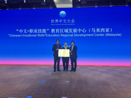 会议期间,张扬建受邀出席中文教育相关协议签署暨授牌仪式,接受马来西亚彭亨阿苏丹阿都拉大学“中文+职业技能”教育区域发展中心牌匾。这是学校在海外中文教育与职业技能融合领域的重要突破。此外,张扬建一行还会见了毛里塔尼亚努瓦克肖特大学孔子学院、马来西亚彭亨阿苏丹阿都拉大学孔子学院、巴西里约热内卢天主教大学孔子学院代表团,就孔子学院及国际中文教育的发展前景进行了富有成效的讨论。学校国际交流与教育学院/孔子学院工作中心还参加了2025年世界中文大会主题展。