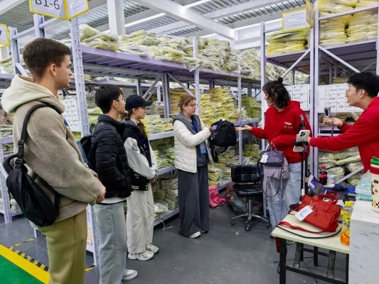 深入腹地,探秘模式。在“前店后厂”特色企业博卜品牌店,“荔枝茉莉冰茶”“青提柠檬气泡茶”“牛油果牛乳”……这些通常在奶茶店里才能看到的标签,在色彩鲜亮的箱包上得到了体现。国际友人对色彩缤纷的背包爱不释手,现场挑选购买并忍不住在直播间向网友推荐。“我们每个系列都配有专属拉头,一个产品系列的设计,从酝酿到上架,通常要半年时间。对于原创品牌来说,有时慢即快。反复推敲打磨的设计,不仅彰显出品牌个性,还能引领潮流”企业负责人介绍。来到河北红颜贸易有限公司,国际友人上手体验了箱包组装,并深入了解了白沟“市场采购+跨境电商”新模式。企业在亚马逊、TikTok等跨境电商平台开了店铺,通过海外平台开店与建设海外仓,实现了“小单快返”和“主动出海”,国际友人对这一模式惊叹连连。步入天尚行箱包皮具有限公司展厅,兼具时尚与功能性的拉杆箱吸引了大家的目光。国际友人亲自测试静音滑轮、密码锁等功能,感受白沟箱包对细节、工艺、品质的极致追求。这里过去做线下销售的工作人员,现在都学会了面向镜头做直播,成功实现了由传统外贸到线上直播的数字化转型。在天德智联中国国际白沟跨境电商基地,国际友人在工作人员的带领下,分别走进数据中心、选品中心、赋能中心和展示中心,深刻感受AI技术在跨境电商领域的应用。依托白沟新城作为中国最大箱包产销基地的优势,基地实现了“产业集群+专业市场+电商”深度融合。
