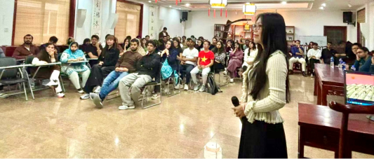 文化体验与诗词吟唱环节则让留学生深度触摸中华诗词之美。文艺部部长孙女夜草同学带领大家共同学习吟诵古典诗词《水调歌头·明月几时有》,她以柔和婉转的歌声为引,引导大家感受苏轼笔下的思乡情怀与美好祝愿。许多留学生被诗词中“千里共婵娟”的情怀所打动,纷纷表示这是他们第一次真正“唱懂”一首中国古诗。