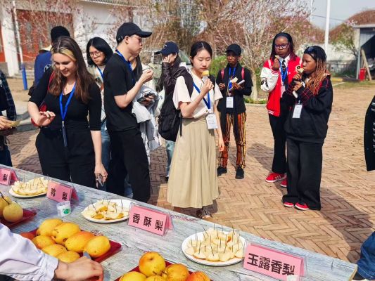 在沙窝程茂兰天文馆,同学们沉浸式聆听中国近代天体物理学奠基人程茂兰先生的传奇故事,感悟他深耕科学的执着人生,程茂兰先生藏在岁月里的家国情怀、仰望星空的科学精神和深厚的人文底蕴,也深深烙印在每一位留学生心中。之后,留学生品尝了博野鸭梨、雪梨、香酥梨和玉露香梨,并走进沙窝梨园,观赏距今八百多年的“古梨树王”。